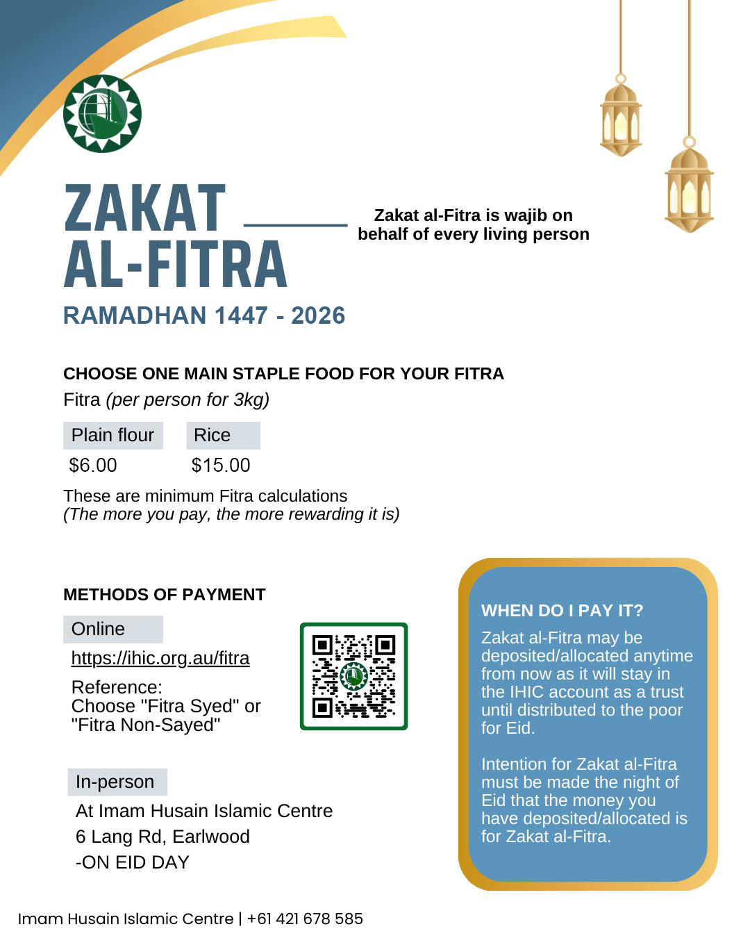 Zakat al-Fitra for 2026 has been calculated for the staples of Rice and Flour. Please see the poster for full details and how to pay. Remeber – Zakat al-Fitra is wajib to be paidĀ  on th emorning of Eid day before salat. You may make the transfer any time before then, however you must renew your intentionĀ  on Eid morning.